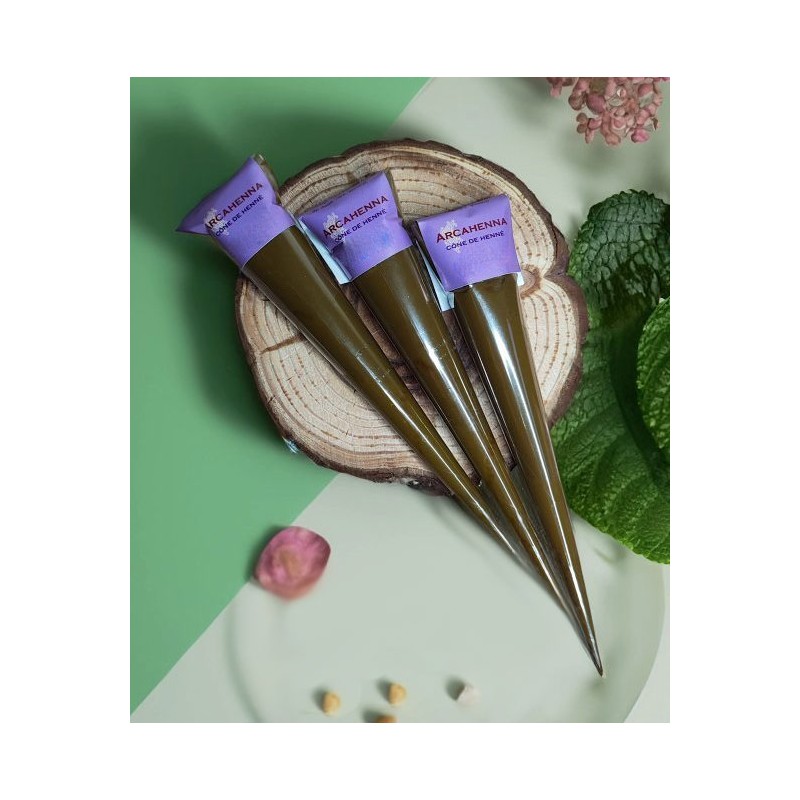 Profitez de ces cônes pour tester la nouvelle récolte de henné du Rajasthan (henné, eau, sirop de glucose, acide citrique, huile essentielle de tea tree et de cajeput et/ou niaouli ou eucalyptus).